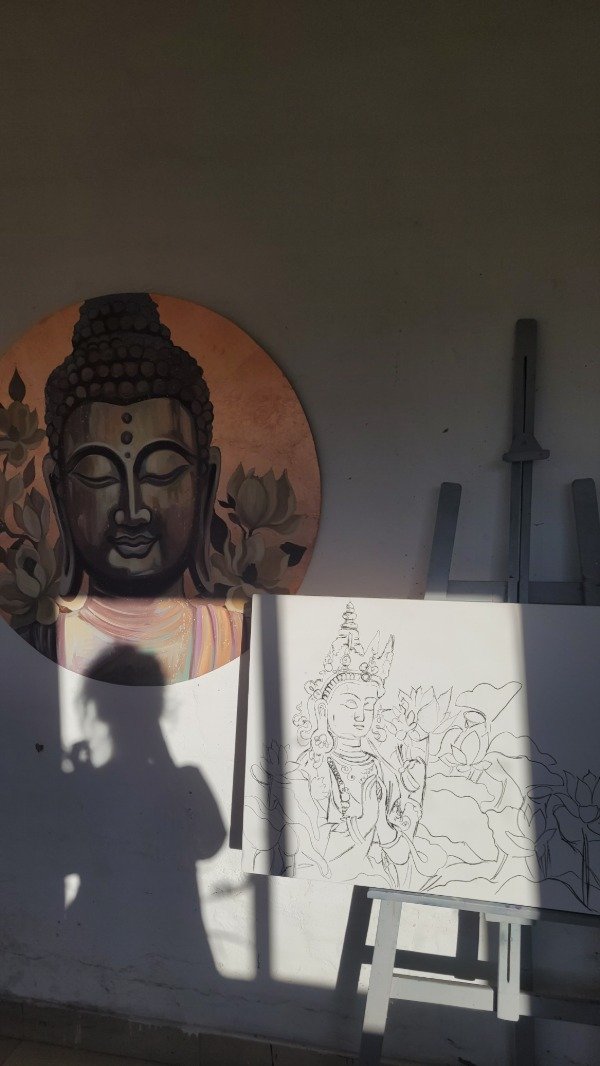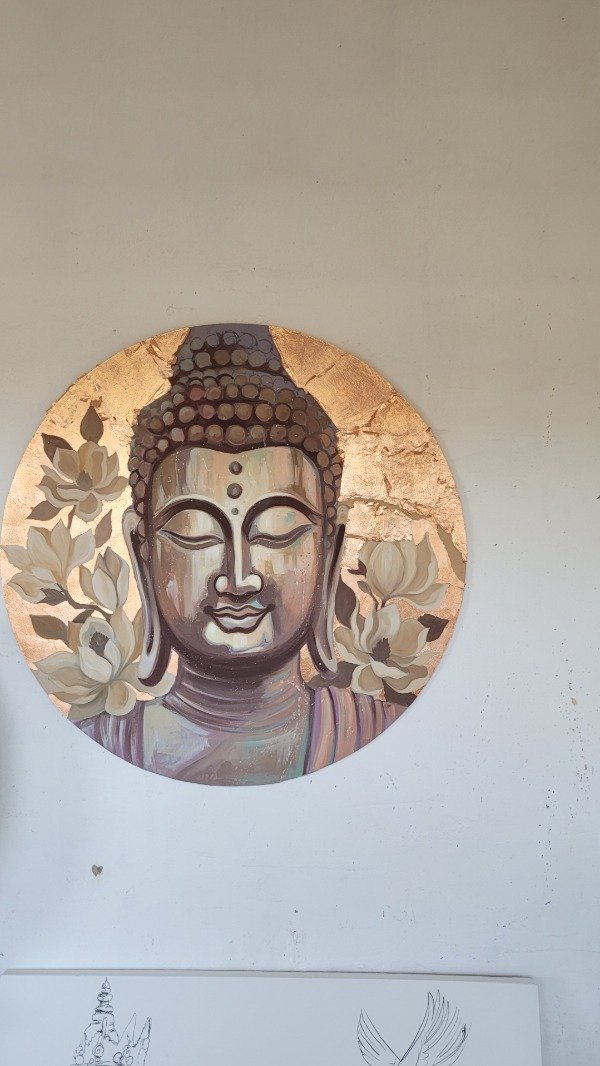 Buda con Magnolias en formato circular, fondo trabajado con cobre a la hoja.